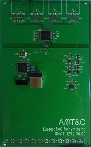 Для управления АЦП, получения данных, выполнения их предобработки и передачи на компьютер используется 8-битный микроконтроллер с аппаратной поддержкой USB. Питание цифрового вольтметра осуществляется с помощью трансформаторного блока питания типовой топологии на тороидальном трансформаторе и малошумящих линейных регуляторов. Плата вольтметра выполнена согласно стандартам Eurocard, имеет размеры 100х160 мм, соединяется с кросс-платой (коммутационной платой) разъёмом DIN 41612.
