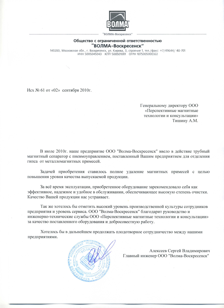 Отзыв о работе сепаратора от ООО "Волма-Воскресенск"