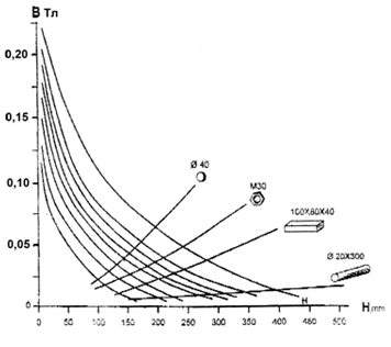 Изображенное на рис.3 семейство кривых - зависимости магнитного поля от расстояния, для ряда железоотделителей различного размера и глубины извлечения. А пересекающие их четыре линии показывают, в каких условиях происходит извлечение стальных предметов различной формы: пересечение этих линий с графиками В (Н) указывает расстояние, на котором действующая на данный предмет магнитная сила превышает его вес. Данный рисунок наглядно иллюстрирует, что величина поля не является единственным параметром, определяющим извлечение стальных примесей.