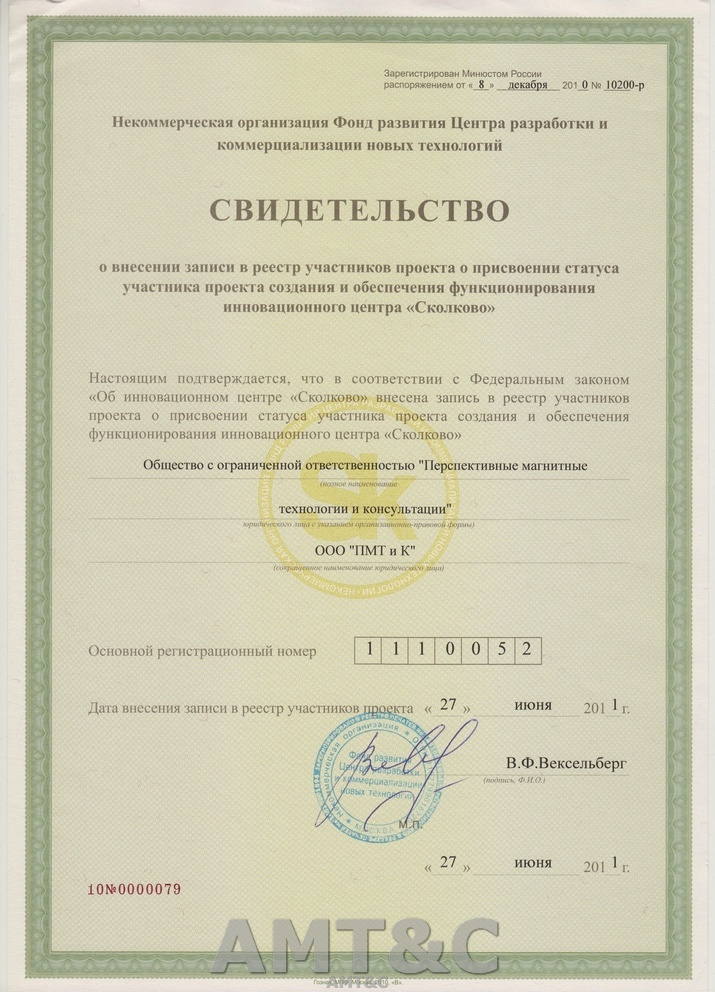 Свидетельство о внесении записи в реестр участников проекта о присвоении статуса участника проекта создания и обеспечения функционирования инновационного центра "Сколково"