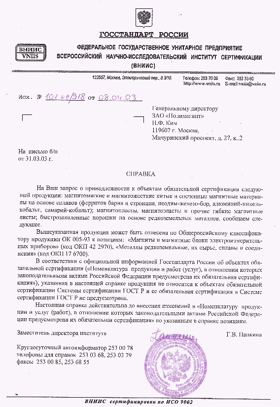 Справка о принадлежности к объектам обязательной сертификации магнитомягких и магнитожестких материалов