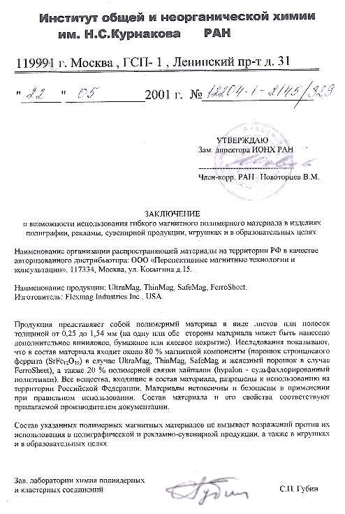 Заключение о возможности использования гибкого полимерного магнитного материала в изделиях полиграфии, рекламы, сувенирной продукции, игрушках и в образовательных целях