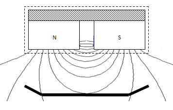 Принцип построения магнитной системы подвесного железоотделителя следует из его назначения: извлекать ферромагнитные предметы, обычно достаточно крупные, с большого расстояния, а иногда и из-под толстого слоя основного продукта. По этой причине, в отличие от целого ряда других устройств, где эффективное извлечение примесей обеспечивается близким контактом материала с рабочей поверхностью, магнитная система подвесного сепаратора обычно представляет собой два массивных магнитных полюса. Картина магнитного поля, создаваемого такой системой, показана на рис.2.