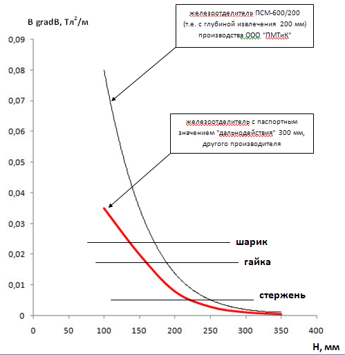 Тот факт, что примеси различной формы извлекаются с различной глубины, позволяет недобросовестным производителям манипулировать понятием глубины извлечения, завышая параметры своего оборудования. Часто для того, чтобы дополнительно замаскировать ситуацию, вводятся термины, значение которых не объясняется потребителю, например "дальнодействие", "глубина промагничивания" и т.п. Красной кривой на рис.4 показана, в качестве примера, характеристика такого железоотделителя, который по документации производителя позиционируется как имеющий "дальнодействие" 300 мм. На деле такое устройство, как показывают приведенные на рис.4 результаты наших измерений, обеспечивает глубину извлечения не более 150 мм. Т.е. данный сепаратор с "дальнодействием" 300 мм является заметно менее эффективным, чем даже железоотделитель с глубиной извлечения 200 мм производства ООО "ПМТ и К".